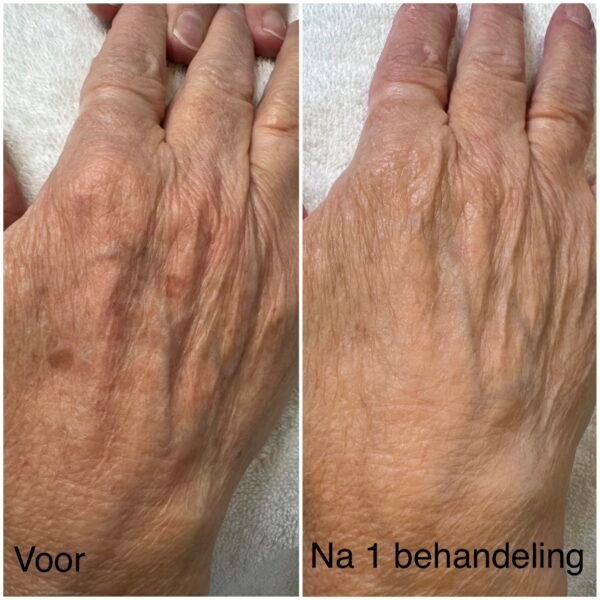 - Laser- of IPL behandeling: heel geschikt voor het behandelen van zogenaamde ouderdomsvlekken. Het teveel aan pigment wordt lokaal verhit, waardoor de pigmentvlekken een stuk lichter worden, of zelfs helemaal verdwijnen.
